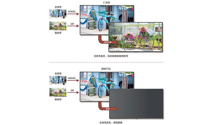 C 系列顯示器提供信號冗余備份功能,更是可以通過菜單設置自定義信 號的優先級